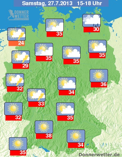 Mit den Gewittern am Mittwoch stellt sich die Wetterlage leicht um, so dass in den nächsten Tagen heißere Luft nach Deutschland strömt. Der Höhepunkt wird wohl am Wochenende erreicht. Am Samstag liegen die Werte meist schon wieder deutlich über 30 Grad, vor allem in der Osthälfte auch um 35 Grad. Am heißesten wird es am Samstag nach dem jetzigen Stand der Vorhersagen wahrscheinlich in Baden-Württemberg mit Temperaturen um 38 Grad. Vor allem im Westen Deutschlands entstehen wieder Schauer und Gewitter.