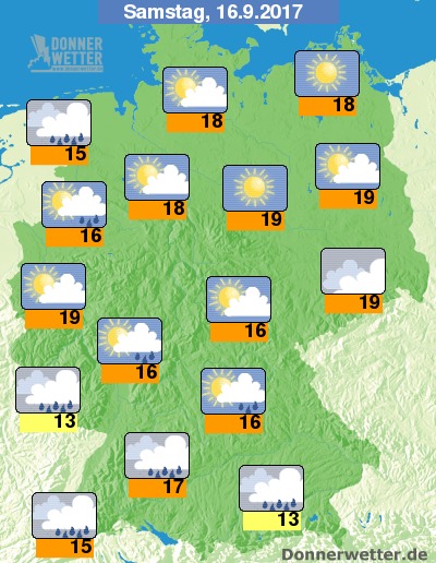 Am Samstag ist der Himmel über dem Süden verbreitet dicht bewölkt und es fällt zeitweise, teils kräftiger Regen. Im Nordwesten zeigt sich das Wetter wechselhaft mit teils dichten Wolken, einzelnen Schauern oder Gewittern, jedoch auch Auflockerungen. Im großen Rest der Bundesrepublik scheint dagegen häufig die Sonne und es bleibt dazu weitgehend trocken. Die Temperatur steigt auf kühle 13 Grad im Saargau und bis 19 Grad in Berlin.