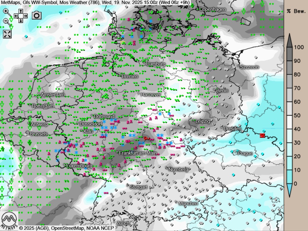 Am Mittwochnachmittag zeigt sich der Himmel über weiten Landesteilen stark bewölkt oder es ist bedeckt. Dabei fällt immer wieder Regen oder Schneeregen, in Schleswig-Holstein und in Hamburg sowie in Lagen über 300 bis 600 m fallen die Niederschläge auch als Schnee. Zum Abend hin gehen die Niederschläge im Norden verbreitet in Schnee über. Vorsicht Glättegefahr!