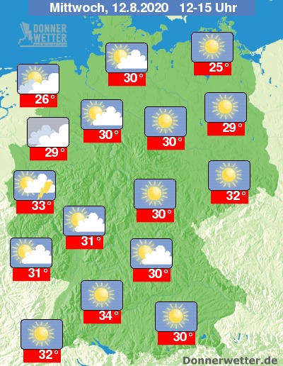 Die Temperaturen steigen im Laufe des Nachmittags gebietsweise noch etwas an und überschreiten an Rhein und Neckar teilweise die 35 Grad - Marke.