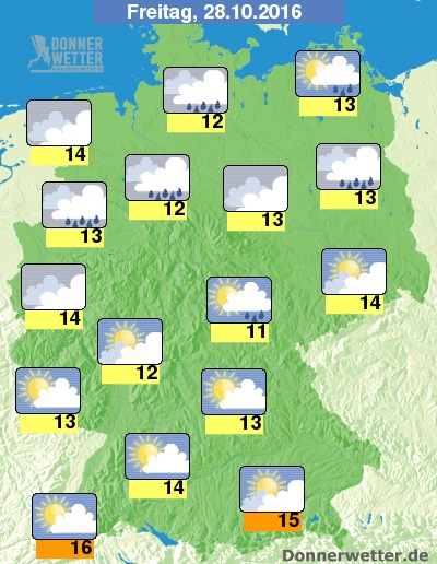 Der Freitag bringt nördlich einer Linie Bremen-Berlin immer wieder Schauer, dazu frischt auch der Wind merklich auf. Südlich des Mains ist es hingegen recht sonnig und nur wenige Wolken trüben das Bild am Himmel. Die Höchstwerte liegen zwischen 11 Grad im Thüringer Bergland und 16 Grad in Baden.