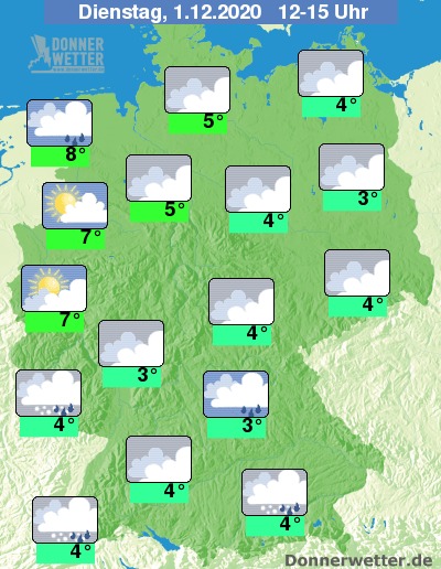 Am frühen Nachmittag verziehen sich die Niederschläge in den Süden. Je nach Höhenlage fällt Regen oder Schnee. Streckenweise muss daher mit Glätte durch Schnee oder Schneematsch gerechnet werden. Im Norden trocknet die Luft ab, die Wolkendecke bleibt aber meistens dicht. Lediglich in Teilen NRW´s könnte die Sonne mal hervorblinzeln.