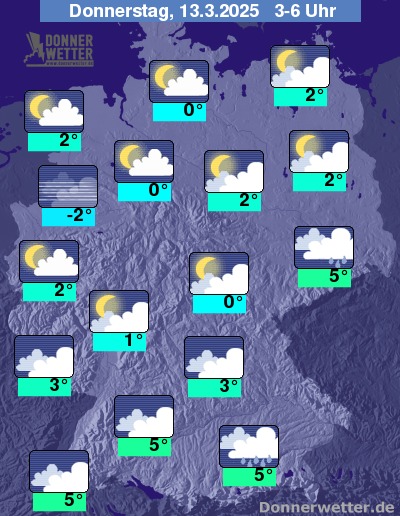 Die Temperaturen gehen in den frühen Morgenstunden zurück auf Werte um 5 Grad südlich der Donau und -2 Grad im Münsterland.