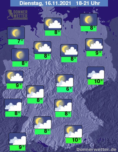 Heute Abend zeigt sich der Himmel im Norden und Westen meist locker bewölkt oder sternenklar, sonst ist es dagegen überwiegend stark, teils auch aufgelockert bewölkt. Es bleibt trocken bei 6 Grad in Jena und bis etwa 10 Grad in München.