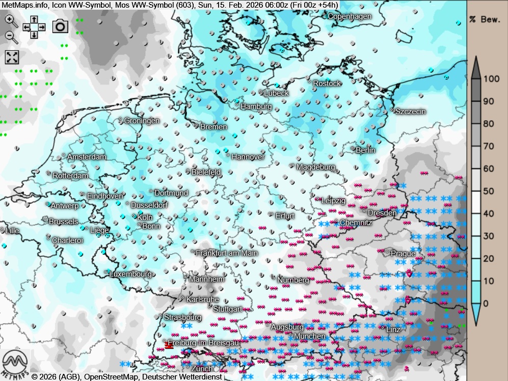 Am Sonntag wechseln sich über weiten Landesteilen Sonne und Wolken ab, in Alpennähe sind anfangs noch Schneefälle zu erwarten. im Tagesverlauf nimmt die Bewölkung von Westen her zu und es setzten Schneefälle ein.