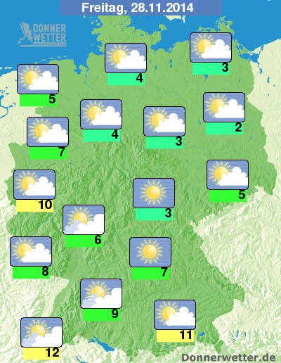 Der Freitag hat vielerorts wieder deutlich mehr Sonnenschein zu bieten als noch der Donnerstag. Besonders von der Mitte bis in den Osten Deutschlands kann sich nach Auflösung von Nebel oder Hochnebel häufig die Sonne zeigen und zum Teil wird es sogar sonnig. Etwas häufiger zeigen sich im Südwesten und Westen Wolken, dabei kann sich aber ebenfalls die Sonne immer wieder zeigen. Es bleibt dazu überall trocken. Die Temperatur steigt auf 2 Grad an der polnischen Grenze und bis 12 Grad im Breisgau.