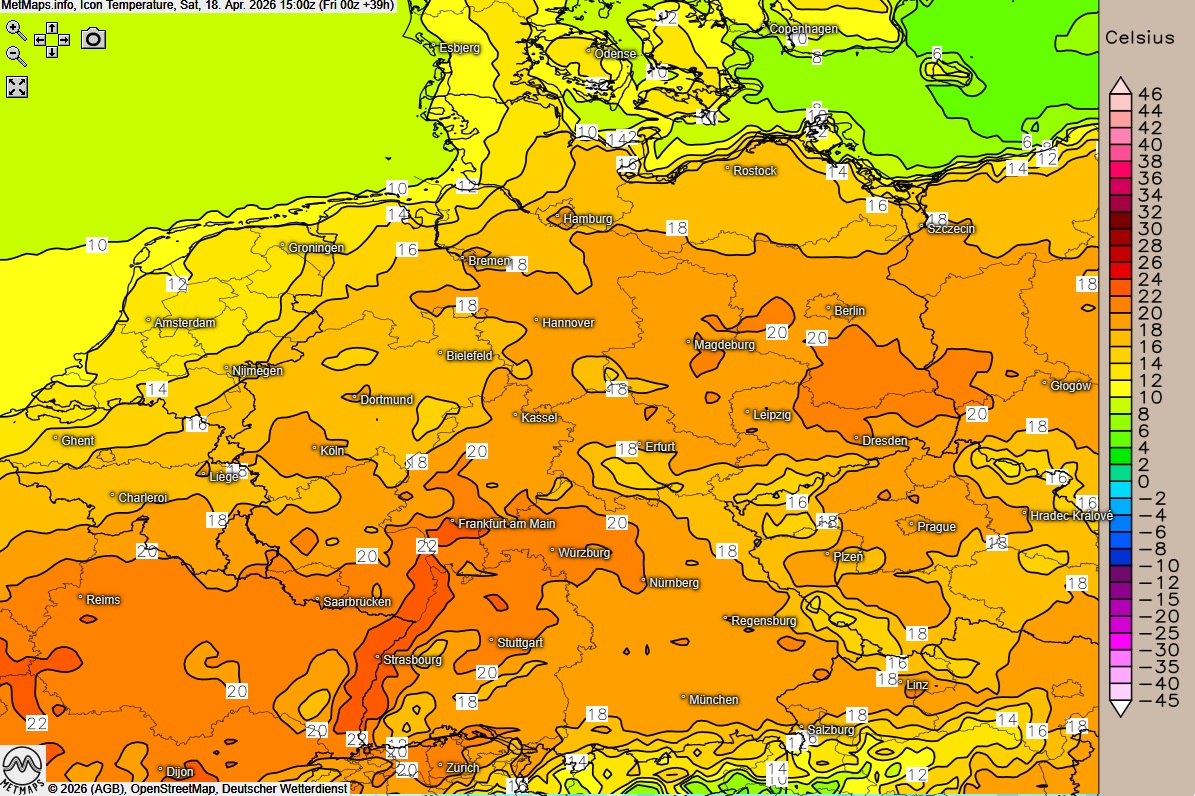 Die Wetterkarte für 06:00 Uhr, die Temperaturkarte für 15:00 Uhr sowie die 24-Stunden-Regenmengen für Samstag nach ICON: