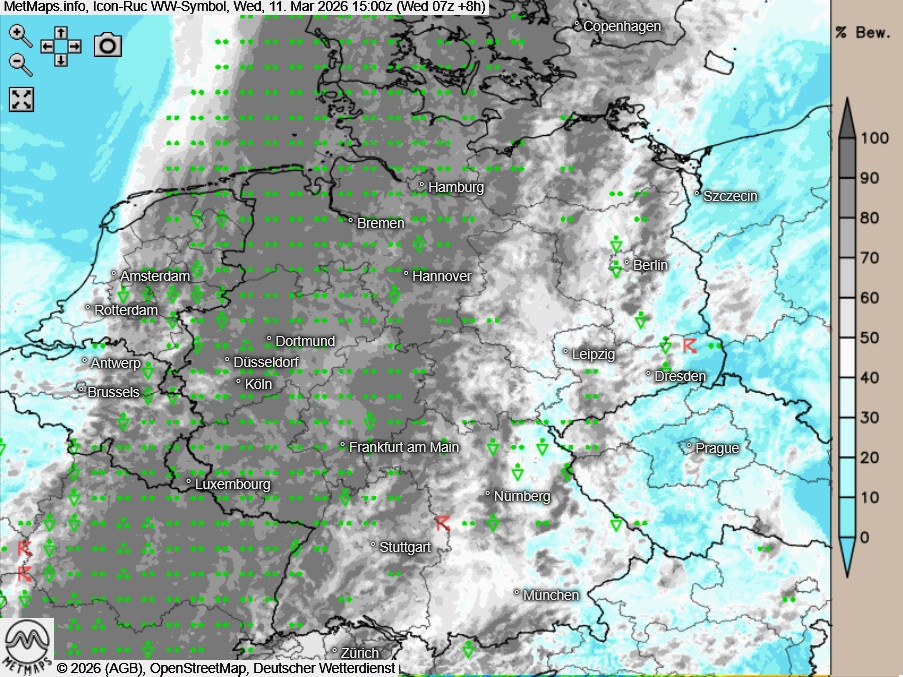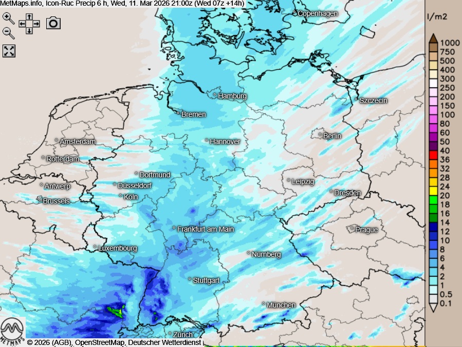 Die Wetter- und Temperaturkarte für Mittwochnachmittag (15:00 Uhr) sowie die 6-Stunden-Regenmengen bis 21:00 Uhr nach ICON-RUC: