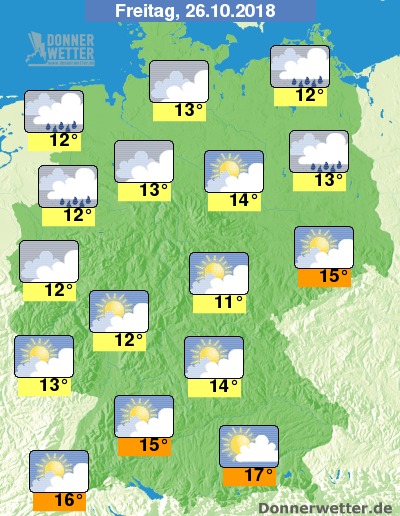 Die Höchsttemperaturen liegen allgemein zwischen 11 und 15 Grad, im Süden sind örtlich bis zu 18 Grad möglich.