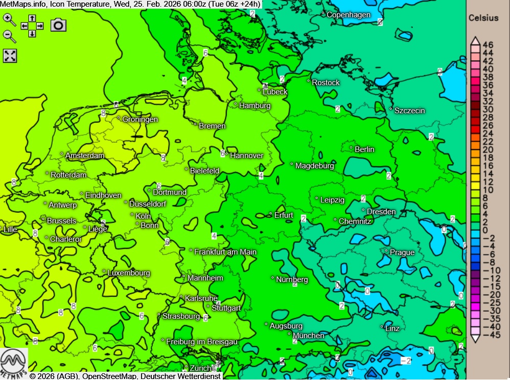 Die Wetter- und Temperaturkarte für Mittwochfrüh (06:00 Uhr) sowie die Temperaturkarte für 15:00 Uhr nach ICON: