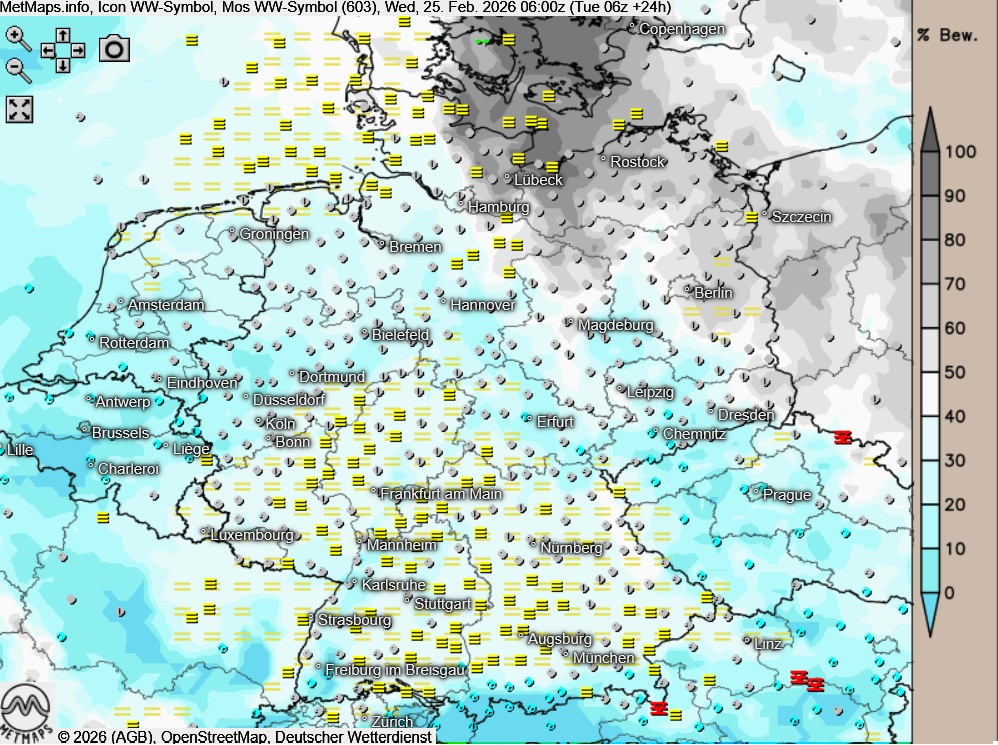 Am Mittwoch hält sich zunächst teils dichter Nebel oder Hochnebel. Im Tagesverlauf lockern die Wolken vielerorts auf, regional kann sich aber auch am Nachmittag noch zäher Hochnnebel halten. Vor allem im Westen, am Alpenrand und auf den Gipfeln ist es auch sonnig.
