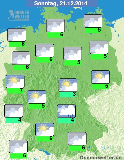 Am Sonntag bleiben die Wolken vor allem im Norden meist dicht, aber auch sonst ist es nur hier und da aufgelockert, denn meist zieht eher starke Bewölkung durch. Dazu fällt aber nur gelegentlich etwas Regen oder Schneeregen. An der See weht ein teils kräftiger Wind. Die Temperatur steigt auf 3 Grad im Vogtland und bis 8 Grad an der Ems.
