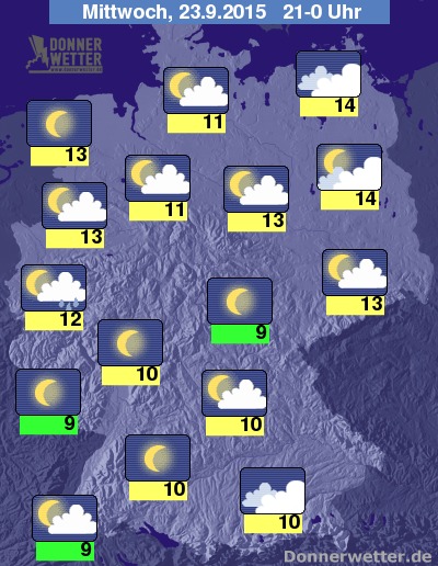 In der Nacht zum Donnerstag halten sich im Alpenvorland und auch im Südwesten des Landes meist dichte Wolken, dabei kann gebietsweise Regen fallen. Im übrigen Bundesgebiet ist es wechselnd bewölkt und mit Ausnahme des Nordseeumfelds, wo sich einzelne Schauer entwickeln können, bleibt es auch trocken. Gebietsweise zeigt sich auch ein sternenklarer Nachthimmel. Die Temperatur sinkt auf 13 Grad an der Nordsee und bis 7 Grad in Franken.