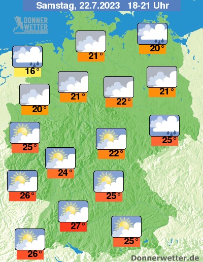 Heute Abend ist es über der Nordhälfte des Landes weitgehend bedeckt und im Nordwesten zieht Regen auf, an der Ostsee und über der Lausitz sind lokale Schauer möglich. Weiter im Süden ist es dagegen teils heiter bis aufgelockert, teils auch stärker bewölkt, aber weitgehend trocken. Die Temperatur liegt bei 16 Grad in Bremerhaven und 27 Grad in Stuttgart.
