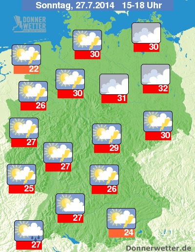 Heute Nachmittag ist es zum Teil aufgelockert bewölkt, gebietsweise ziehen aber auch dichte Wolken auf und es können sich teils kräftige Schauer und Gewitter entwickeln. Die größten Chancen auf trockenes Wetter haben der Nordosten und die Küsten. Die Temperatur steigt auf angenehme 22 Grad an der Nordseeküste und heiße 32 Grad in Berlin.