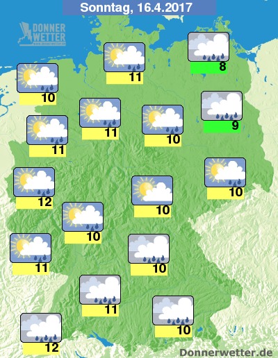 Heute bleibt der Süden meist bedeckt, im übrigen Bundesgebiet zieht auch oft dichte Bewölkung durch, hin und wieder zeigen sich hier jedoch auch Auflockerungen. Im gesamten Land bilden sich gebietsweise Schauer. Die Temperatur erreicht Werte zwischen 8 Grad in Rostock und etwa 12 Grad im Breisgau und Rheinland.