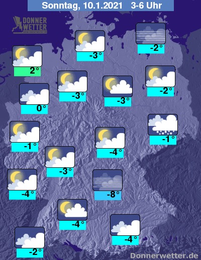 In der kommenden Nacht fällt über Sachsen unter dichten Wolken immer wieder Schnee. Im übrigen Land ist es teils stark, teils locker bis aufgelockert bewölkt, dazu bleibt es bis auf seltene Flocken trocken. Es bildet sich stellenweise Nebel bei Tiefstwerten von 2 Grad an der Nordseeküste und bis -8 Grad in Oberfranken.