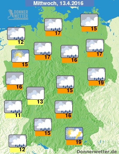 Heute ziehen überwiegend dichte Wolken durch, im Norden ist es anfangs noch oft locker bis aufgelockert bewölkt und dazu trocken, sonst fällt insbesondere über der Südhälfte schon zeitweise Regen. Im Tagesverlauf zieht es sich auch im Norden mehr und mehr zu und es entwickeln sich hier, wie auch im übrigen Land wiederholt Schauer und lokal auch Gewitter. Die Temperatur steigt auf teils nur 11 Grad am Pfälzer Wald und bis 19 Grad im Osten von Bayern.