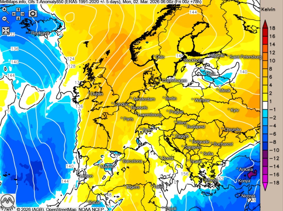 Die Wetter- und Temperaturkarte sowie die Temperaturabweichung Europa für Montagfrüh (06:00 Uhr) nach GFS: