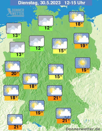 Heute Nachmittag ist es überwiegend heiter oder sonnig, vor allem im Norden und Westen ziehen allerdings einige, zum Teil auch dichte Wolken durch, dabei bleibt es weitgehend trocken. An den Alpen sind lokale Schauer jedoch möglich. Die Temperatur liegt bei nur 12 Grad in der Norddeutschen Tiefebene und etwa 21 Grad in Oberbayern.