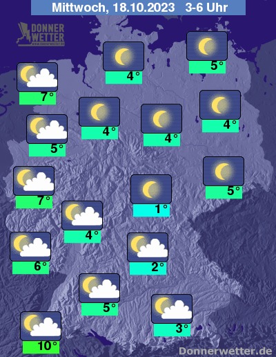 In der Nacht zum Mittwoch ist der Himmel zunächst verbreitet sternenklar. Im weiteren Nachtverlauf ziehen in den Süden und Westen einige, meist lockere Wolkenfelder, dazu bleibt es trocken. Die Temperatur sinkt auf 10 Grad in Freiburg und bis 1 Grad in Jena.