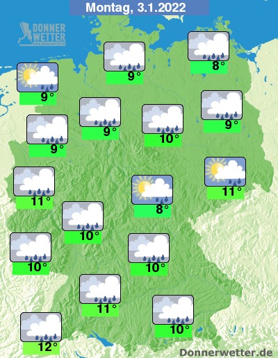 Heute ziehen weitgehend dichte Wolken durch, dabei setzt im Tagesverlauf aus Westen auch neuer Regen ein. Die Temperatur steigt auf 8 Grad in Erfurt und bis 12 Grad in Freiburg. An den Küsten weht noch ein oft stürmischer Wind.