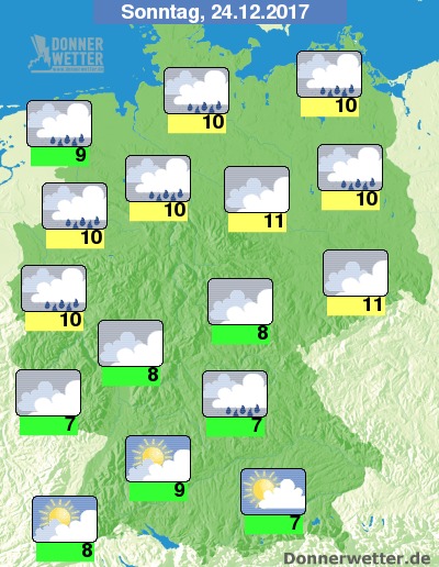 Am heutigen Heiligabend kann sich zumindest im Alpenvorland häufig die Sonne zwischen meist lockeren Wolken zeigen, dazu bleibt es trocken. Weiter nach Norden hin werden die Wolken hingegen dichter und vor allem über der Nordhälfte Deutschlands fällt zudem zeitweise Regen. Die Temperaturen steigen auf milde 7 Grad im Saargau und bis 11 Grad in der Lausitz.