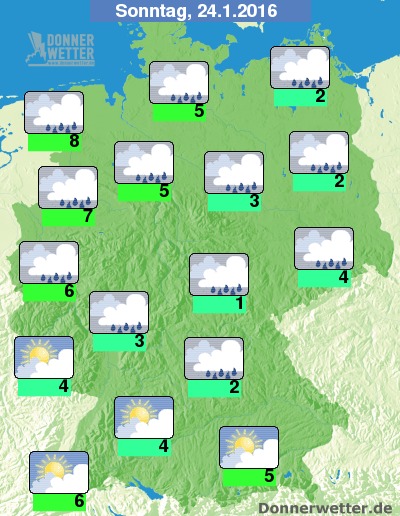 Am Sonntag sind im Süden hier und da Auflockerungen möglich, sonst halten sich dagegen weitgehend dichte Wolken, dazu bleibt es anfangs noch verbreitet trocken. In den Norden und Westen zieht jedoch Regen auf, der sich im Tagesverlauf auch auf den Osten ausbreitet, im Süden bleibt es hingegen meist trocken. Erst zum Abend hin erreicht der Regen etwa die Mainlinie. Die Temperatur steigt auf 2 Grad an der polnischen Grenze und bis 8 Grad an der nördlichen Ems.