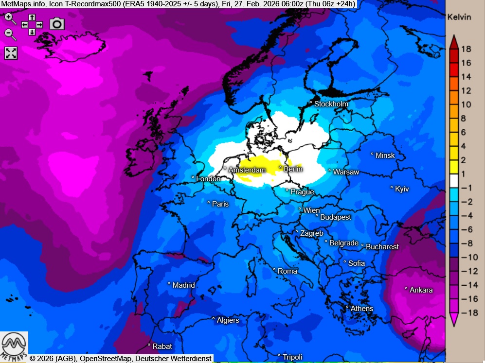 Die Temperatur- und Wetterkarte sowie die Abweichung von der absoluten 500 hPa-Höchsttemperatur um 06:00 Uhr (ICON):