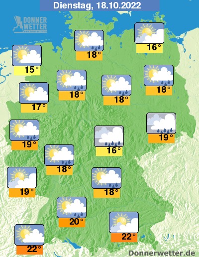 Am Dienstag ist es über dem Norden und Westen oft heiter, teils ziehen auch einige Wolken durch, jedoch bleibt es meist trocken. Im übrigen Bundesgebiet ziehen teilweise dichte Wolken durch, teils zeigen sich auch Aufheiterungen, dabei fällt gebietsweise Regen. Die Temperatur erreicht 15 Grad in Bremerhaven und bis 22 Grad in München.