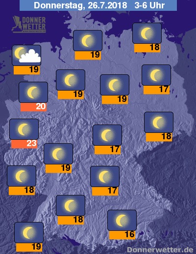 In der bevorstehenden Nacht ziehen im Nordseeumfeld hier und da mal lockere Wolken durch, im übrigen Land zeigt sich der Himmel sternenklar, dazu bleibt es trocken. Die Temperatur sinkt auf sehr tropische 23 Grad in Köln und bis etwa 16 Grad im Münchner Umland.