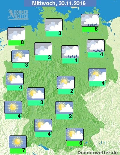 Am Mittwoch zeigt sich über der Südhälfe noch häufig die Sonne bei meist noch lockeren bis aufgelockerten Wolken, dabei bleibt es hier trocken, weiter nach Norden hin ziehen dagegen zumeist dichte Wolken durch und es fällt gebietsweise Regen. Die Temperatur erreicht frische 2 bis 8 Grad.