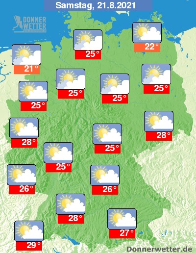 Am Samstag ziehen im Norden oft dichte Wolken durch, teilweise zeigen sich hier aber auch Auflockerungen. Über der Südhälfte des Landes ist es hingegen häufig heiter bis sonnig, teils ziehen einige Wolken durch. Es bleibt zunächst überall trocken, am Abend sind jedoch im Westen erste Schauer oder Gewitter möglich. Die Temperatur erreicht 21 Grad in Cuxhaven und bis 29 Grad in Freiburg.