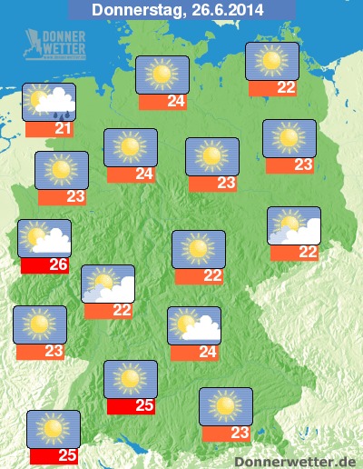 Am Donnerstag ist es verbreitet heiter bis sonnig und es bleibt praktisch überall trocken. Ganz vereinzelte Schauer sind an der niederländischen Grenze so wie am Bayerischen Wald möglich. Die Höchstwerte erreichen um 20 Grad auf den Nordseeinseln und etwa 26 Grad in der Kölner Bucht.