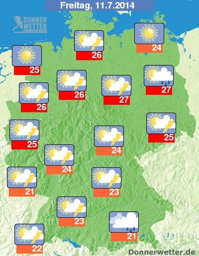Am morgigen Freitag ist es besonders am Vormittag häufig freundlich und trocken. Am Nachmittag bilden sich jedoch, bei teils dichten Quellwolken, gebietsweise Schauer und Gewitter. Trocken bleibt es dabei voraussichtlich im Küstenumfeld. Die Höchstwerte erreichen 21 Grad am Alpenrand und 27 Grad in Berlin-Brandenburg.