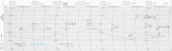 Unser Schrieb zeigt den Luftdruckverlauf der vergangenen sieben Tage. In die neue Woche starten wird wechselhaft, Tief "Yannik" bringt heute verbreitet dichte Wolken, die auch immer wieder Schauer im Gepäck haben.