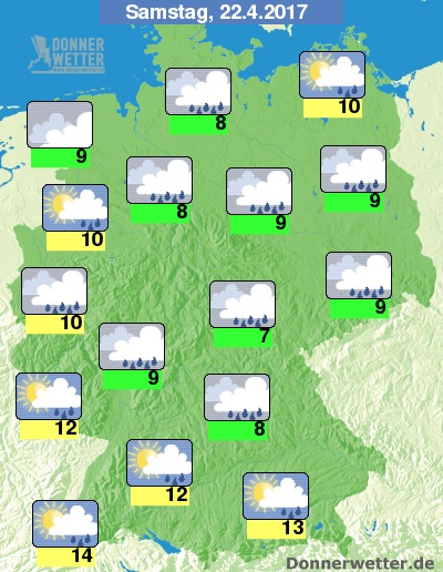 Am Samstag erwartet uns ein wechselhafter Tag. Im Norden und auch über der Mitte zeigt sich der Himmel meist stark, gebietsweise auch aufgelockert bewölkt, dazu bilden sich wiederholt Schauer. Im Süden fällt bei meist dichten Wolken zeitweise Regen. Vor allem zu Tagesbeginn scheint aber auch noch hier und da die Sonne. Die Temperatur steigt auf 8 Grad in der Norddeutschen Tiefebene und bis 14 Grad in Freiburg.