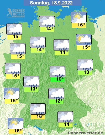 Am Sonntag ziehen oft dichte Wolken durch, hier und da zeigen sich auch mal mögliche Aufheiterungen. Im Süden bilden sich gebietsweise, sonst wiederholt Schauer, im Norden treten zudem örtliche Gewitter auf. Die Temperatur steigt auf teils nur 10 Grad im Thüringer Becken und bis 16 Grad im Breisgau. An der Nordsee ist es verbreitet stürmisch.
