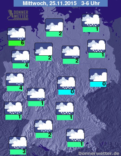 In der folgenden Nacht bleibt es praktisch im ganzen Land bedeckt, dazu fällt im Norden und Westen zeitweise Regen, im Süden und Osten fallen die Niederschläge zumeist in Form von Schnee, teils aber auch als Schneeregen oder Regen. Es besteht verbreitet Glättegefahr. Die Temperatur sinkt auf 6 Grad in Emden und bis auf Werte um 0 Grad im Grabfeld. Im Ostseeumfeld weht weiterhin frischer bis starker und in Böen stürmischer Wind.