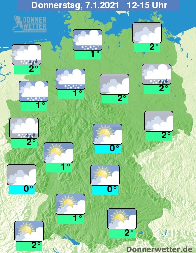 In den Nachmittagsstunden bleibt die Wolkendecke im norddeutschen Tiefland sowie an Rhein und Oder weitegehend geschlossen und vor allem in der Nordhälfte fällt immer wieder Schneeregen oder Schnee. Ein geringes Schauerrisiko und gebietsweise Auflockerungen begrenzen sich am Donnerstagnachmittag auf den Süden Deutschlands, am Alpenrand kann es auch zeitweise aufheitern.