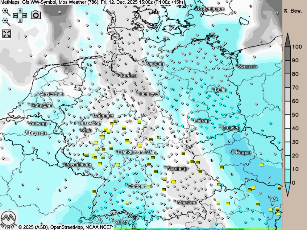 Am Freitagnachmittag zeigt sich der Himmel über der Nordwesthälfte meist stark oder dicht bewölkt. In den übrigen Landesteilen ist es teils neblig-trüb oder hochnebelartig bedeckt, vor allem im Süden und Osten kann aber auch mal längere Zeit die Sonne scheinen. Es bleibt trocken.