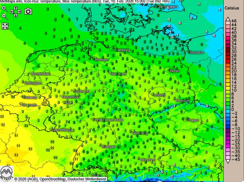 Die Temperaturen erreichen am Nachmittag Höchstwerte um 0 Grad im Nordosten und 11 Grad am Oberrhein. In der Nacht Temperaturrückgang auf 8 bis -2 Grad.