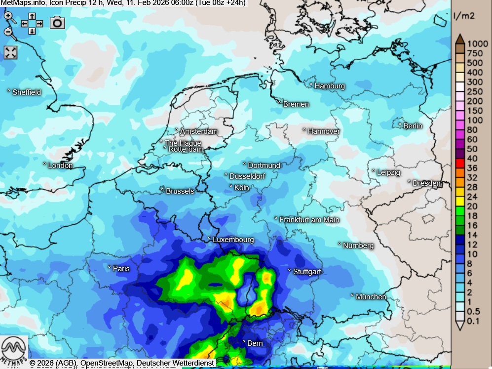 In der Nacht auf Mittwoch greift der Niederschlag dann auch auf den Osten und Nordosten über, hier kann der Regen auf den noch kalten Böden auch gefrieren - Vorischt, Glättegefahr! In den frühen Morgenstunden ziehen von Südwesten dann neue Niederschläge auf, hier kann es auch ergiebiger und anhaltener regnen.