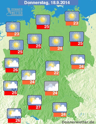 Am Donnerstag herrscht in der Nordhälfte der Republik weiterhin herrliches Spätsommerwetter mit viel Sonnenschein und meist nur wenigen Wolken, dabei bleibt es trocken. In der Südhälfte ziehen dagegen häufig, gebietsweise dichtere Wolken durch, dabei bleibt es ebenfalls meist trocken. Mögliche Schauer und Gewitter bilden sich jedoch in einem breiten Streifen vom Schwarzwald bis ins Saarland. Die Temperatur steigt auf 23 Grad an der Nordsee und bis 27 Grad in Schwaben.