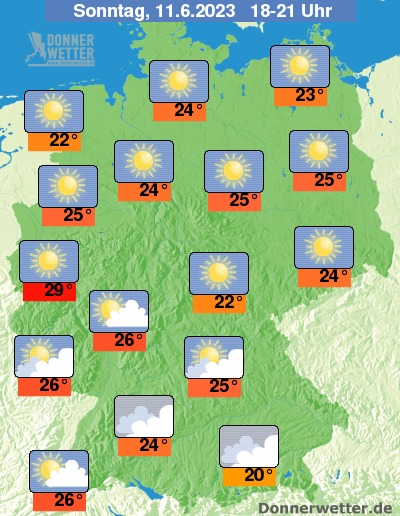 Heute Abend ist es über dem Süden gebietsweise stark, teils auch locker bewölkt, dazu bleibt es hier weitgehend trocken. Weiter nördlich scheint dagegen verbreitet die Sonne von einem oft wolkenlosen Himmel, dazu bleibt es trocken. Die Temperatur liegt bei 20 Grad in Berchtesgaden und bis 29 Grad in Köln.