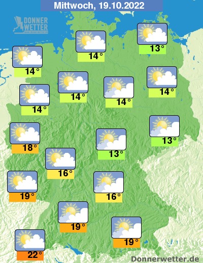 Heute ist es größtenteils heiter oder sonnig, gebietsweise zieht auch starke Bewölkung durch oder es ist neblig-trüb. Es bleibt trocken bei 13 Grad in Rostock und bis zu 22 Grad in Freiburg.