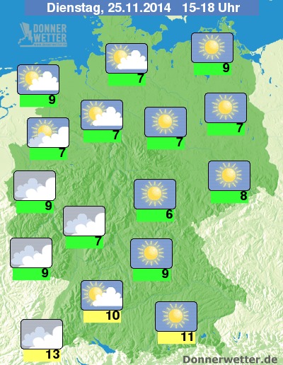 Heute Nachmittag strahlt die Sonne vor allem in der Osthälfte Deutschlands von einem vielfach wolkenlosen Himmel. Nach Westen und Südwesten ziehen dagegen auch schon mal dichtere Wolken auf, diese bringen jedoch keinen Regen. Die Temperaturen liegen bei 6 Grad am Thüringer Schiefergebirge und milden 13 Grad im Breisgau.