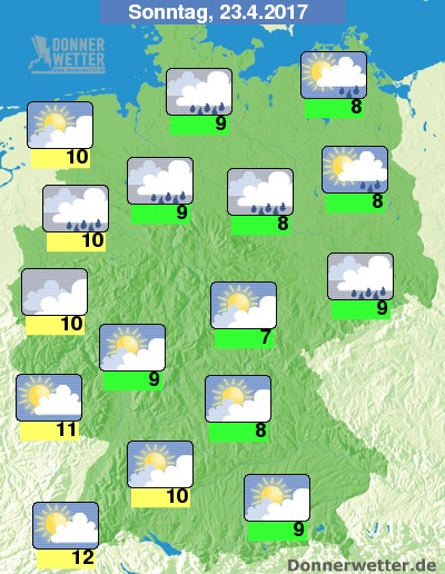 Am Sonntag bringen kompakte Wolken vor allem dem Norden und dem Osten gebietsweise Schauer. Viele und teils dichte Wolken halten sich jedoch auch über dem Süden und Westen, hier bleibt es jedoch weitgehend trocken. Im Südwesten ist es sogar häufig heiter. Die Temperatur erreicht nur kühle 7 Grad im Thüringer Becken und bis 12 Grad im Breisgau.
