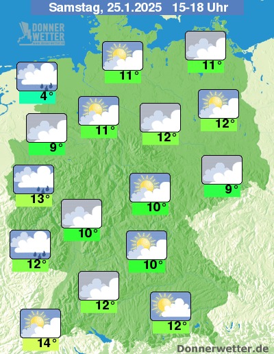Am Samstagnachmittag zeigt sich der Himmel über dem im äußersten Süden und Südosten wechselnd bis aufgelockert bewölkt und es bleibt meist trocken. In den übrigen Landesteilen überwiegt am Nachmittag starke Bewölkung, dabei fällt im Westen und Nordwesten zeitweise etwas Regen.