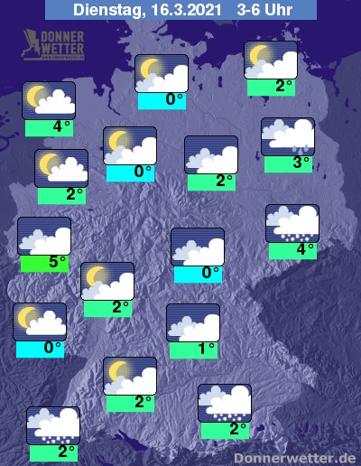 In der Nacht auf Dienstag bleibt der Himmel verbreitet bedeckt oder es ist aufgelockert bewölkt, vor allem zwischen Ostfriesland und dem Pfälzer Wald dominieren anfangs auch noch lockere Wolken. In den Mittelgebirgen sowie am Alpenrand muss in der Nacht noch mit einzelnen Schneeschauern gerechnet werden, in den Staulagen des Erzgebirges und des Schwarzwalds können einige Zentimeter Neuschnee fallen. Die Schneefallgrenze sinkt hier in der Nacht bis in tiefe Lagen. In den übrigen Landesteilen bleibt es meist trocken.